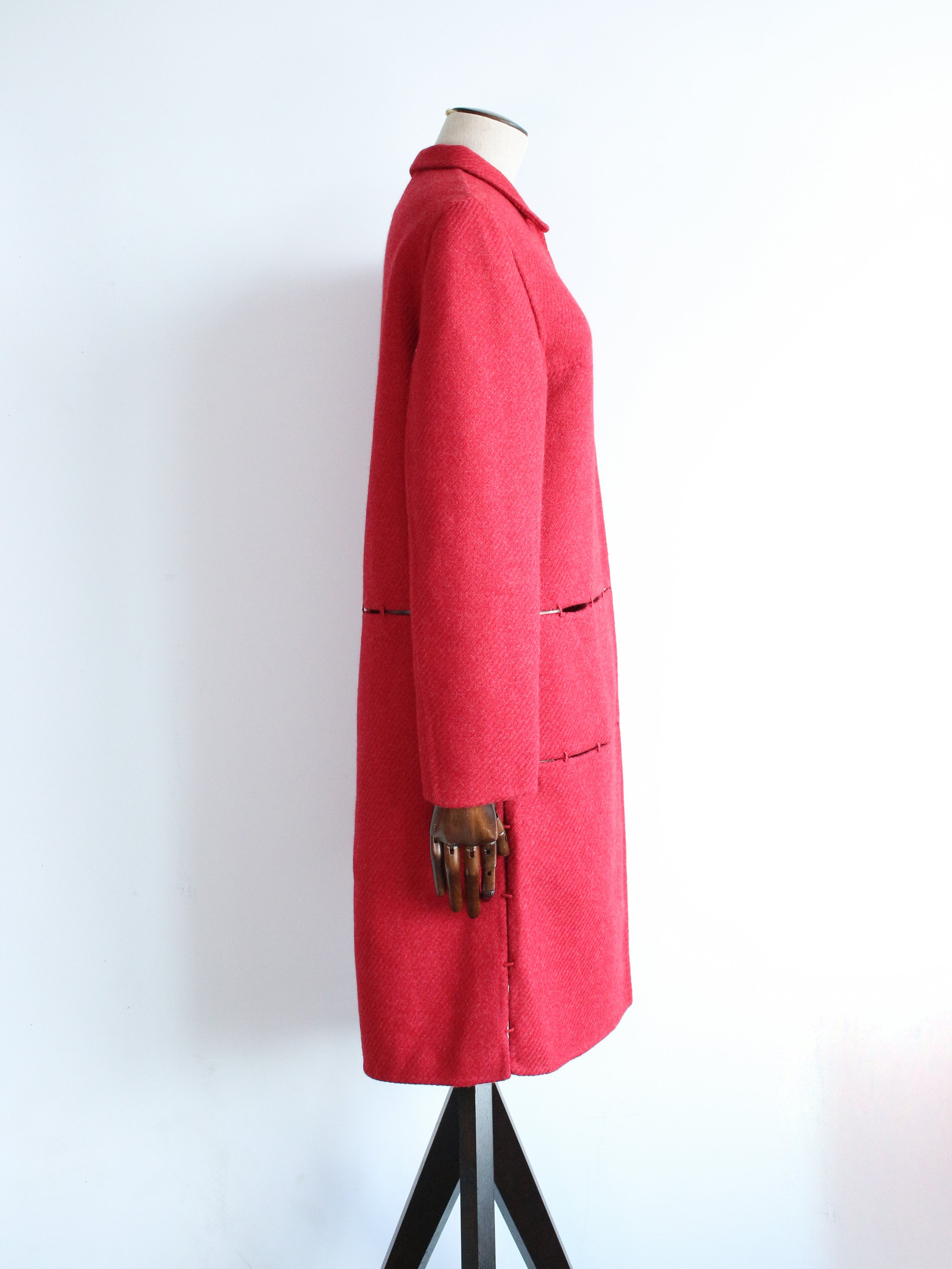 Prada Autumn/Winter 1998 red wool coat with open stitched panels. Fastens with push buttons.