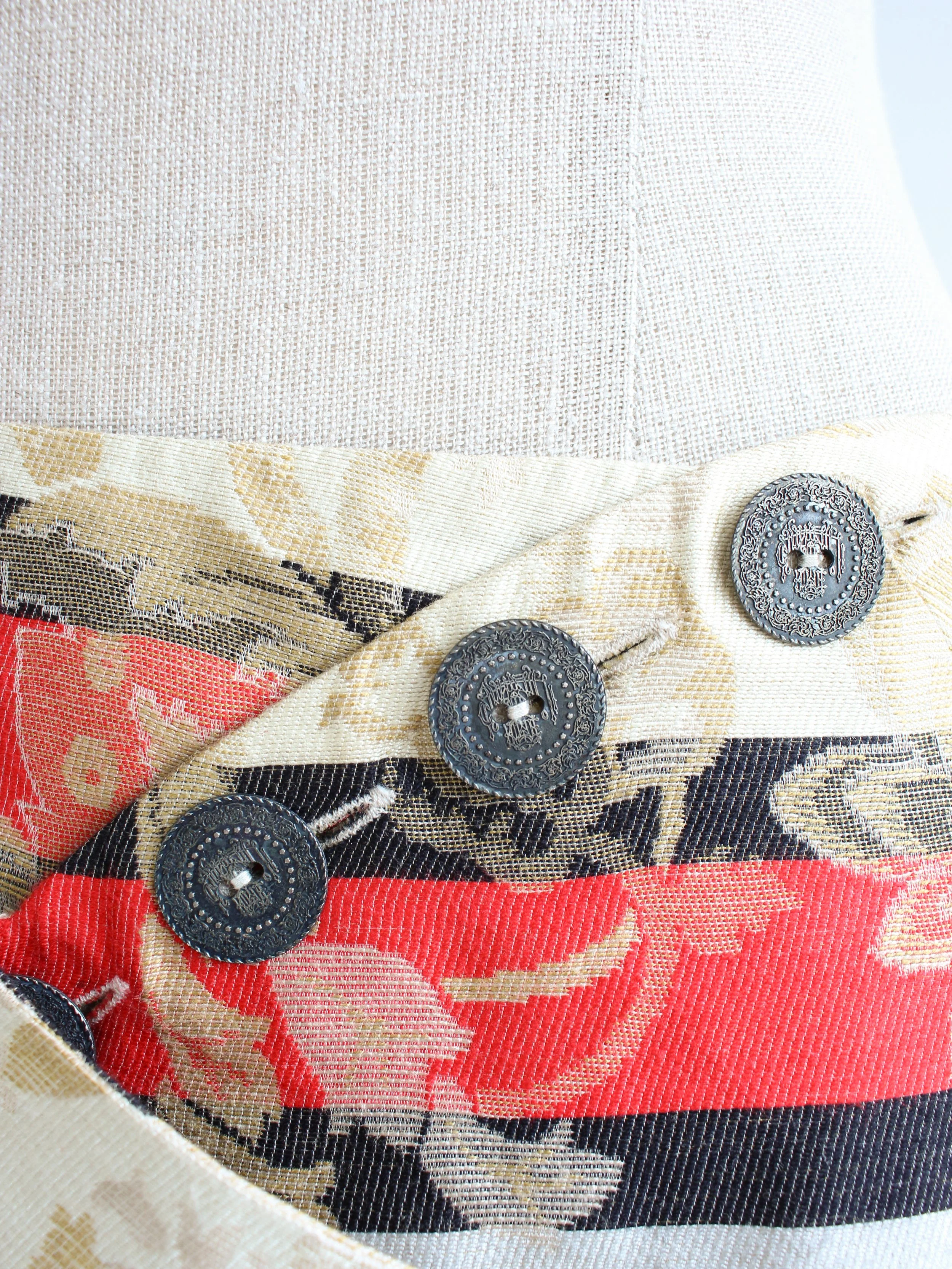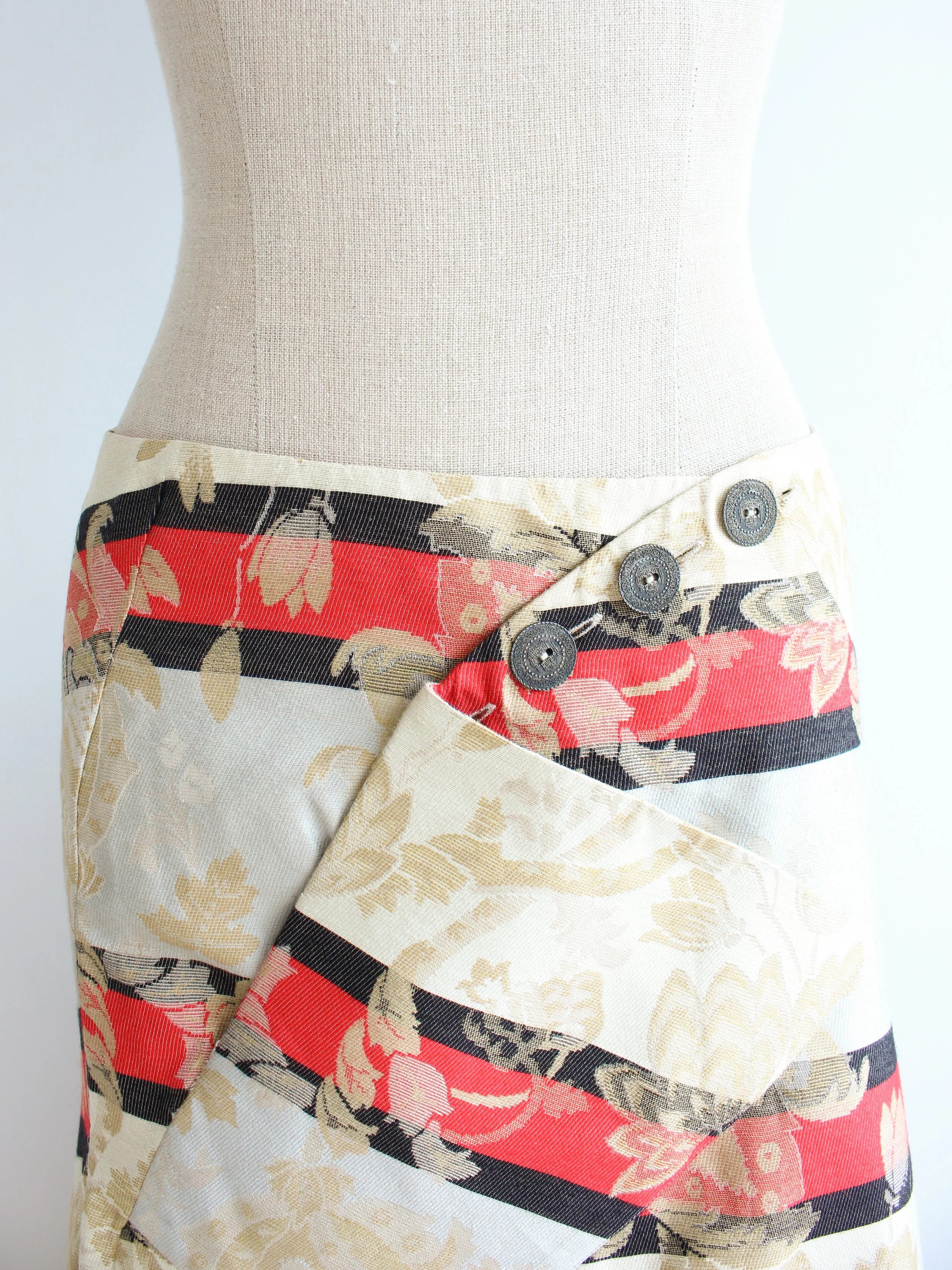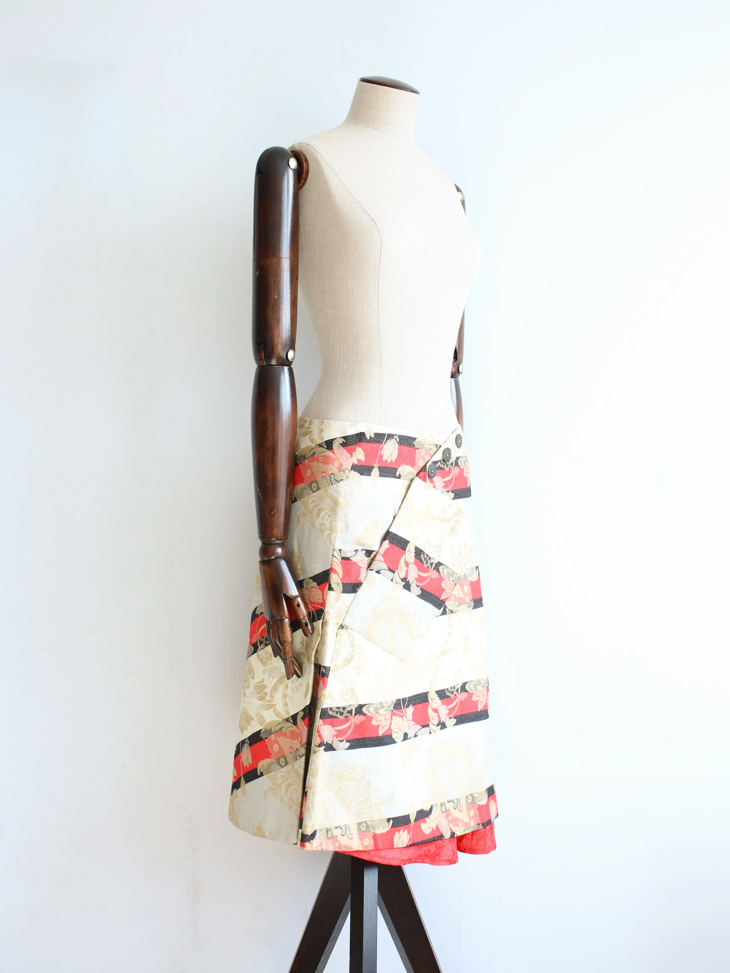 Wrap style skirt that fastens with four coin buttons in the front, patch pocket and pleated back.