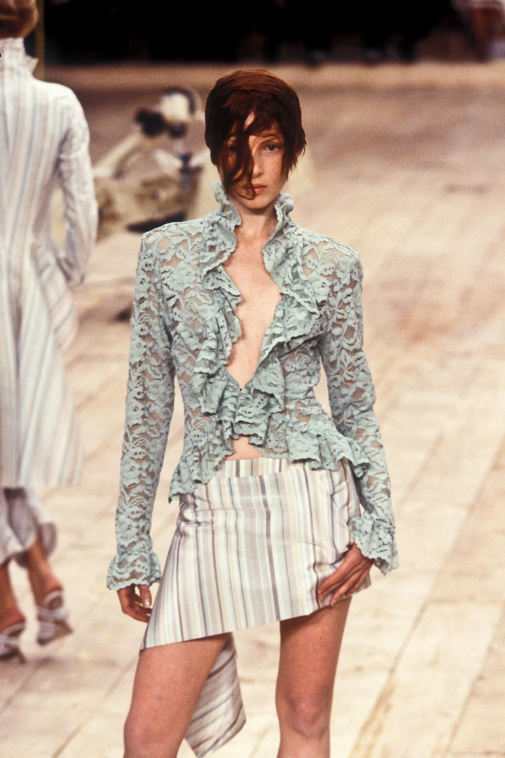 Alexander McQueen Spring/Summer 1999 ‘No.13’ black lace fitted blouse with ruffled collar and placket, flared cuffs, and pearlescent buttons.