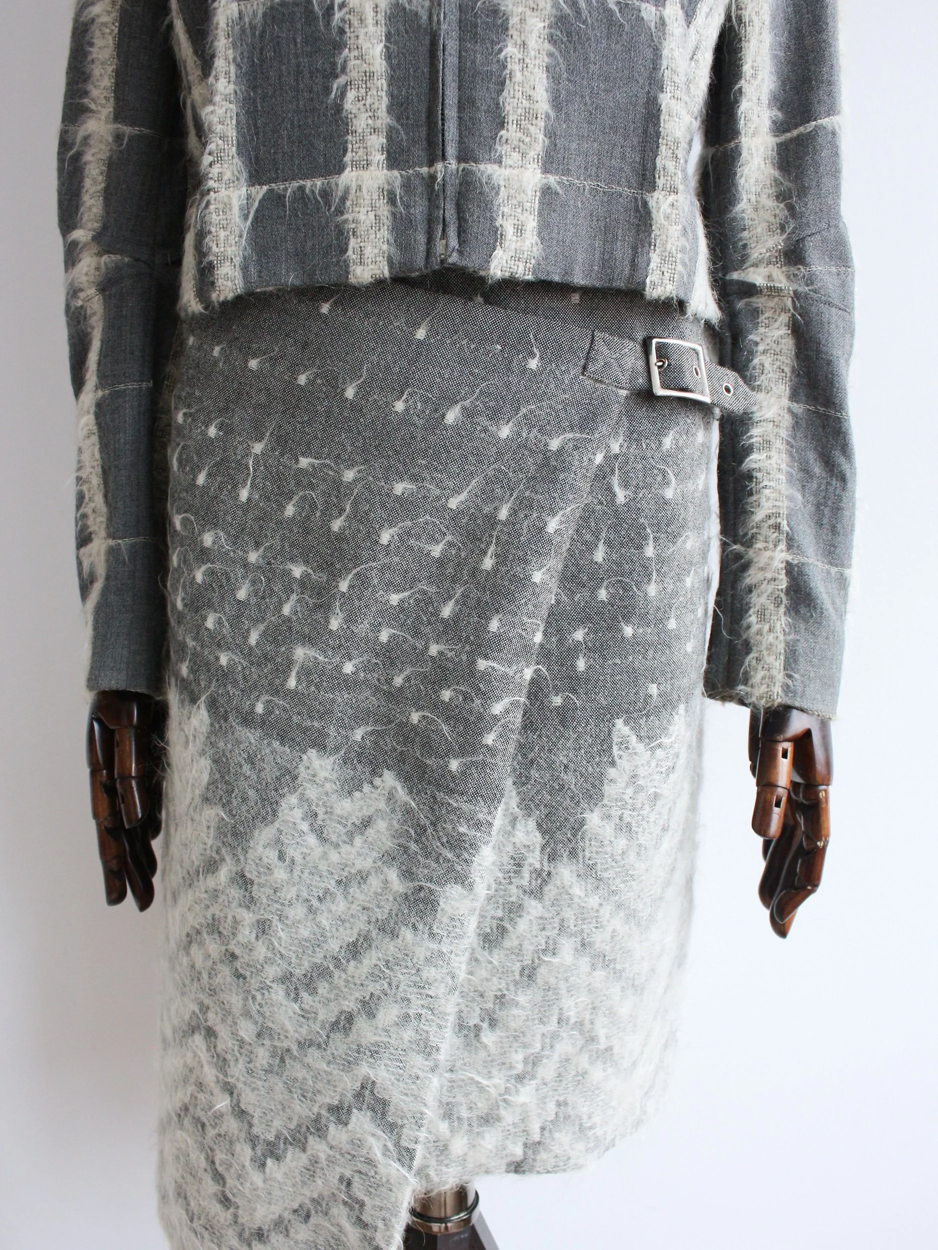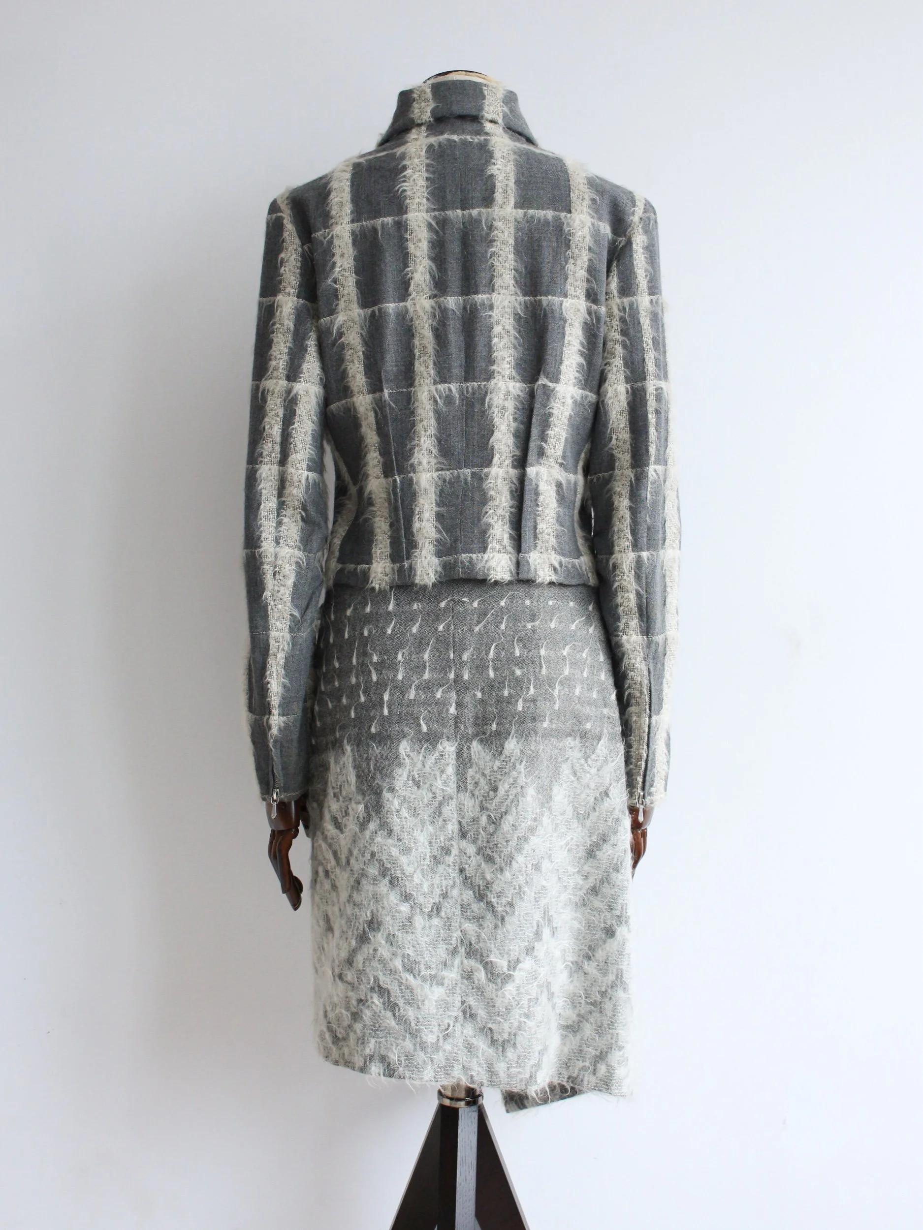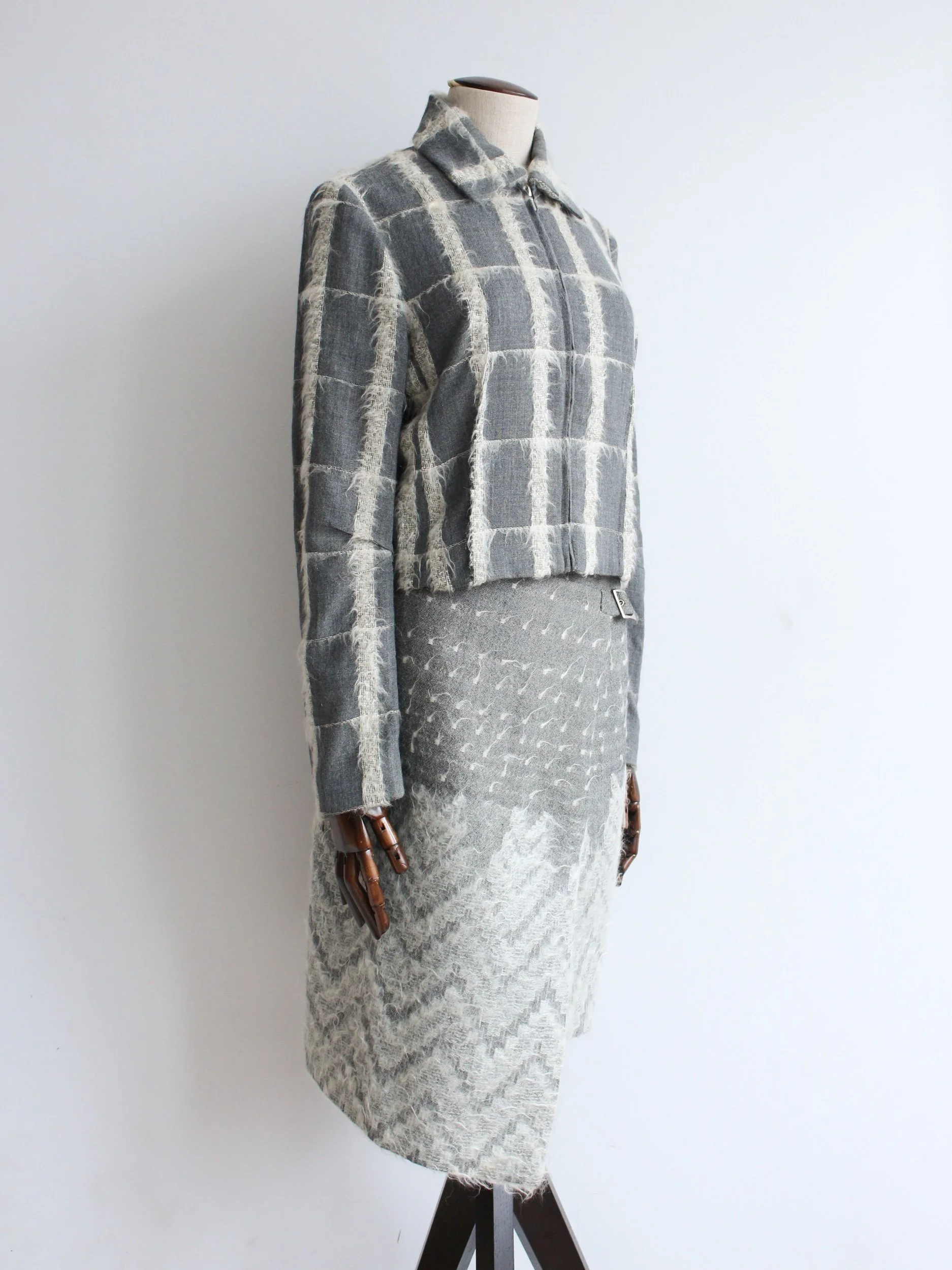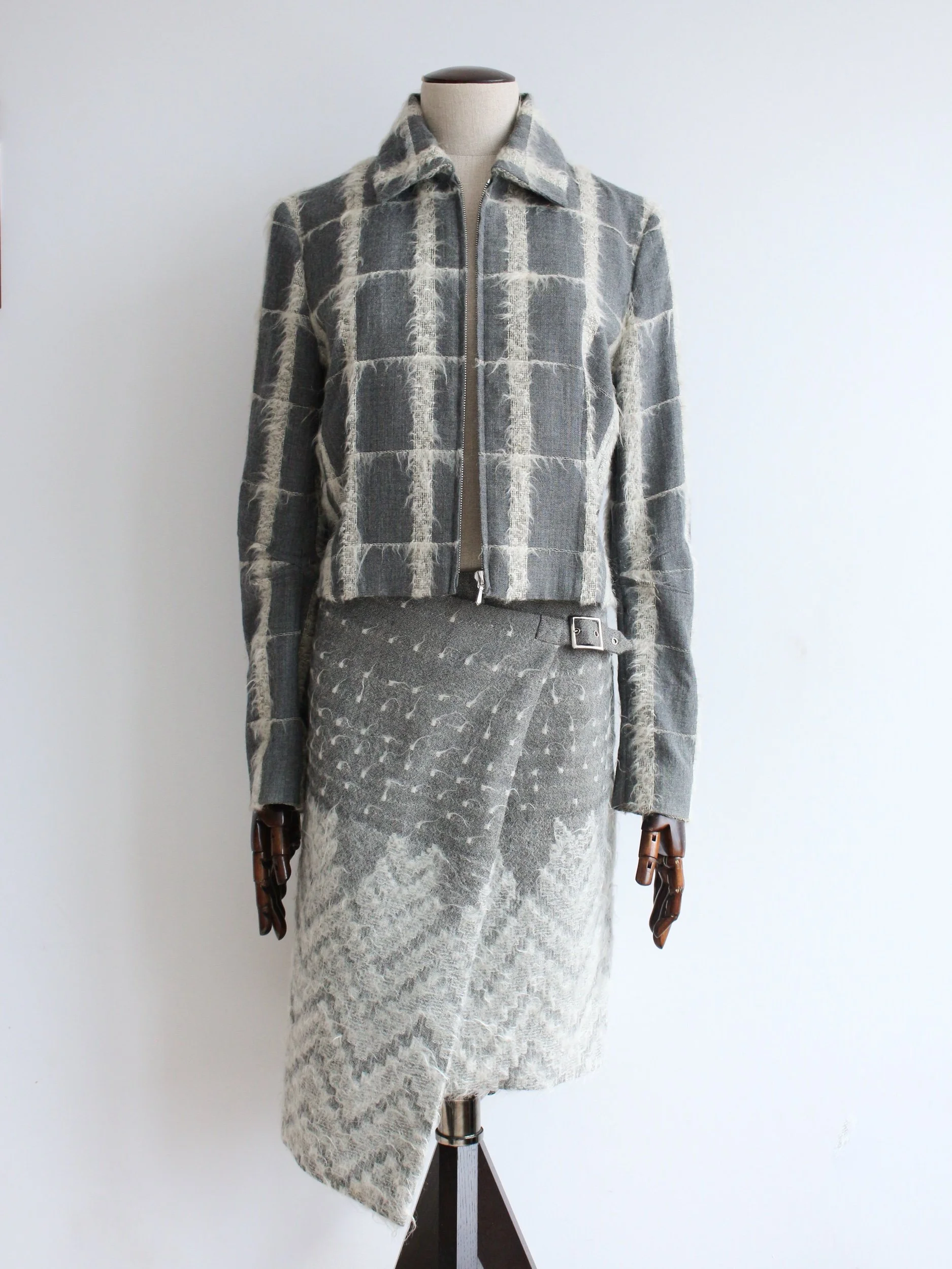 Christian Dior by John Galliano Autumn/Winter 2000 suit comprised of grey zipped jacket with mohair check and belted wrap skirt with mohair details.