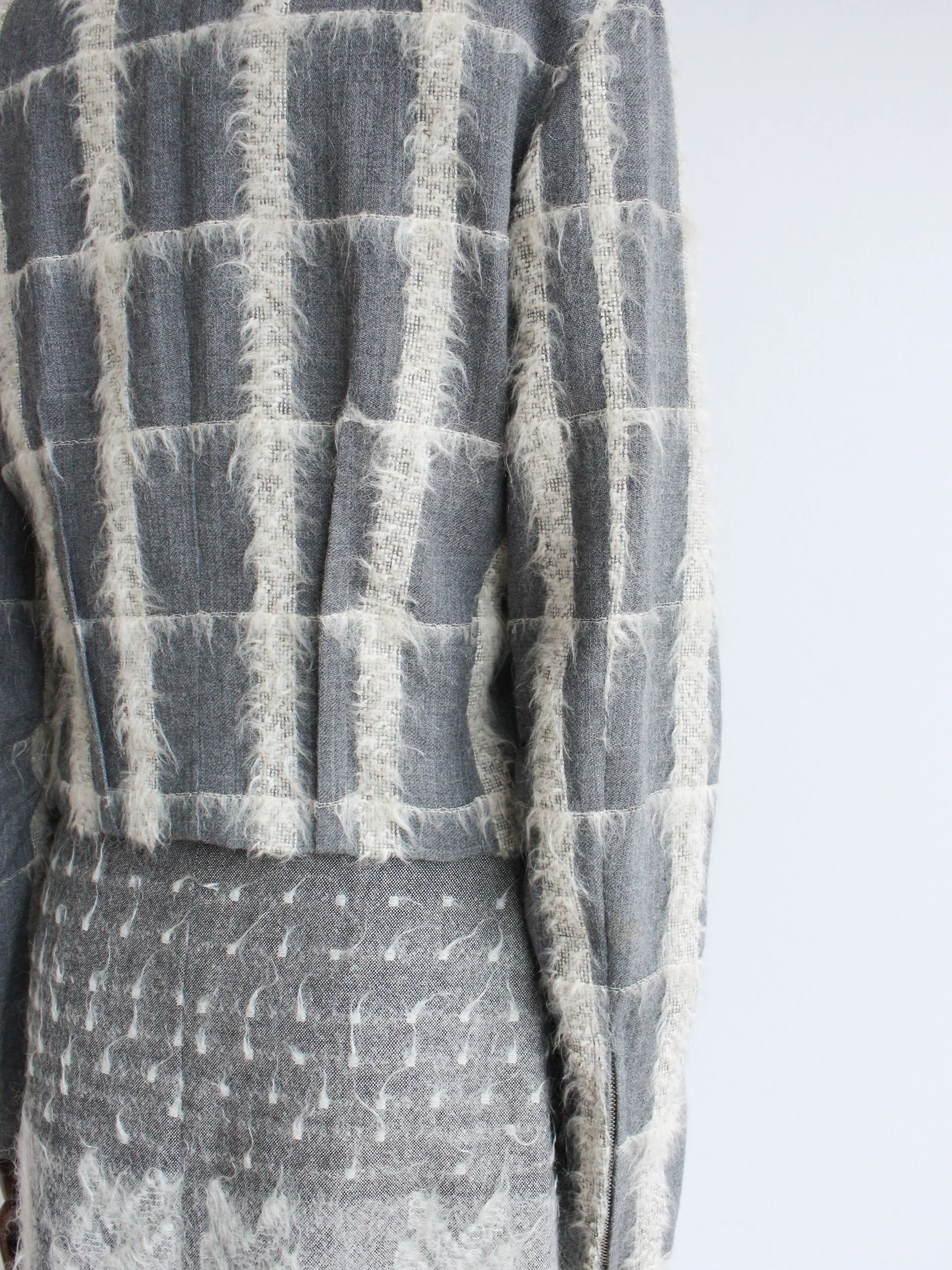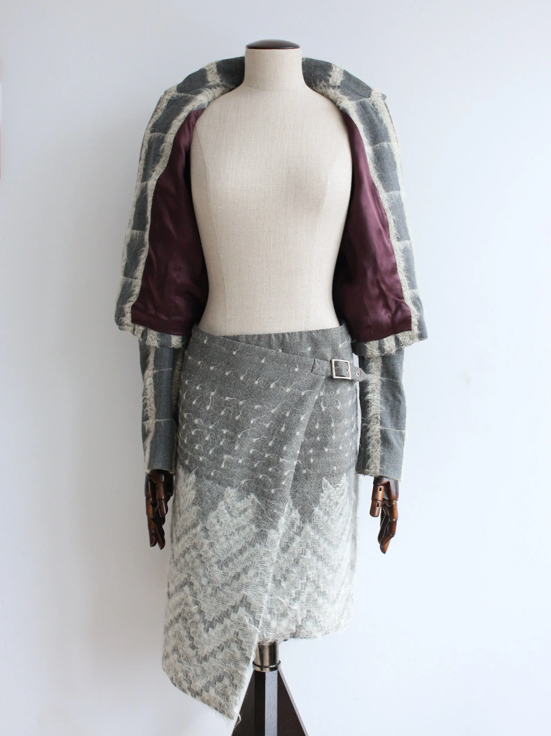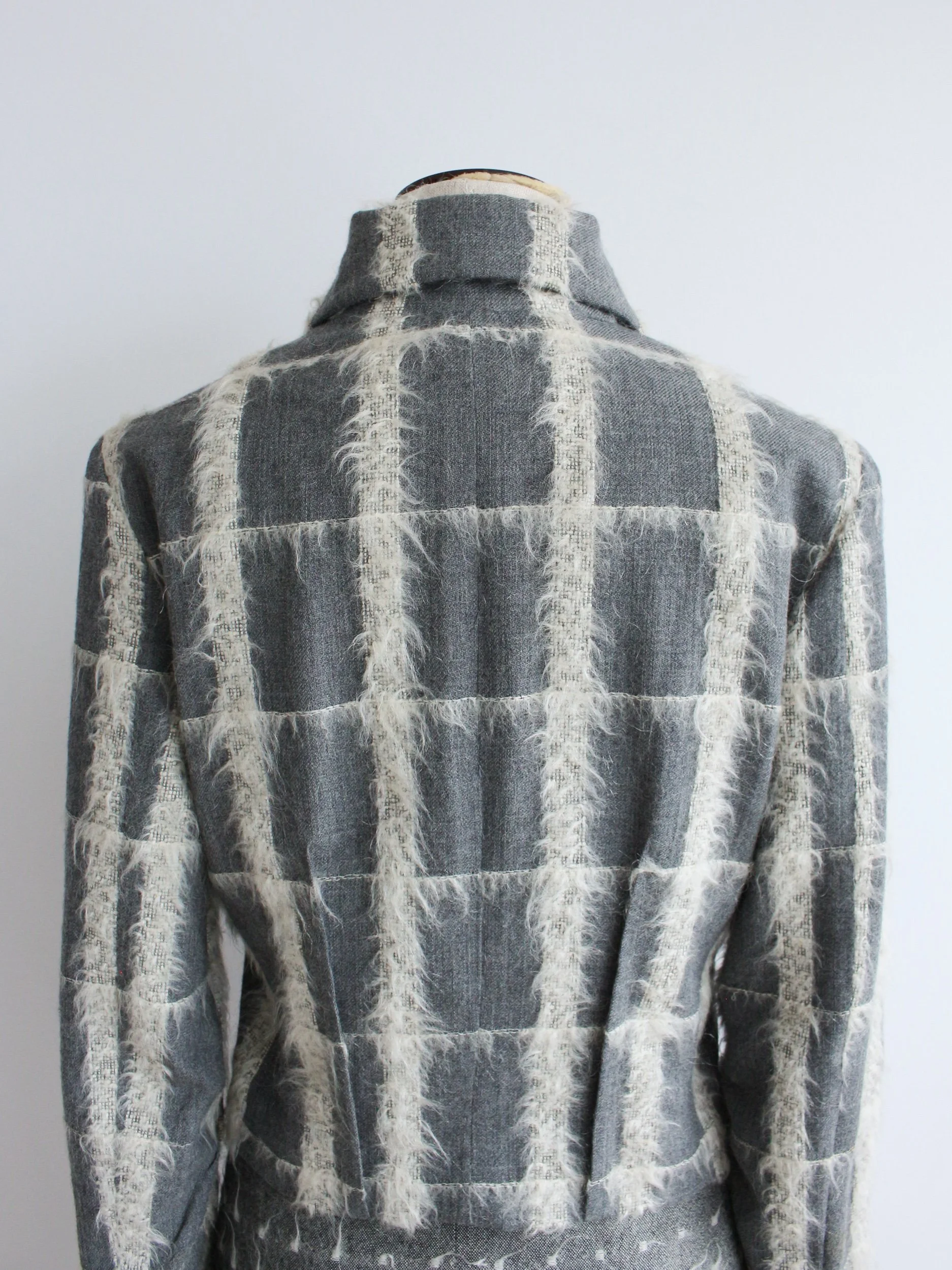 Christian Dior by John Galliano Autumn/Winter 2000 suit comprised of grey zipped jacket with mohair check and belted wrap skirt with mohair details.