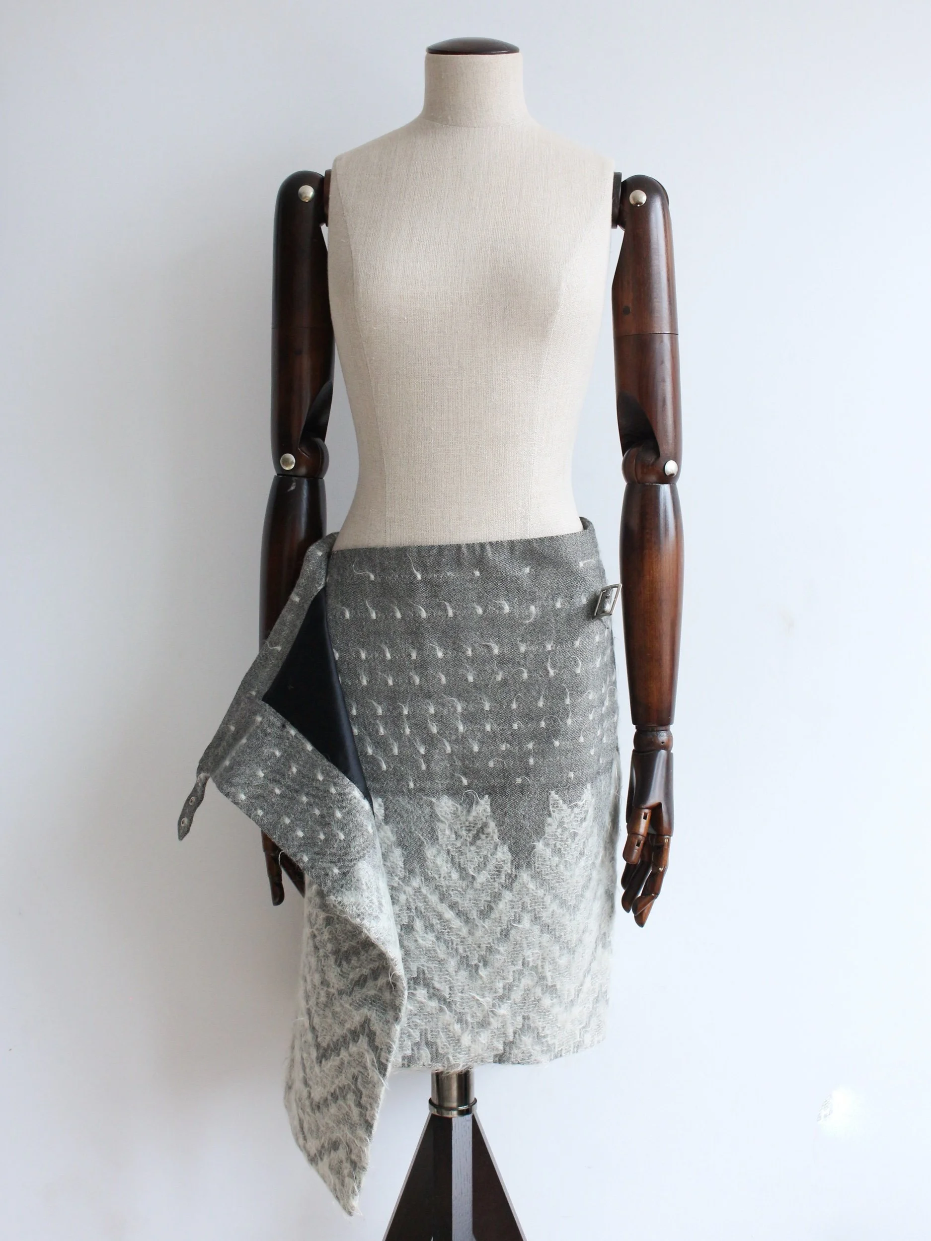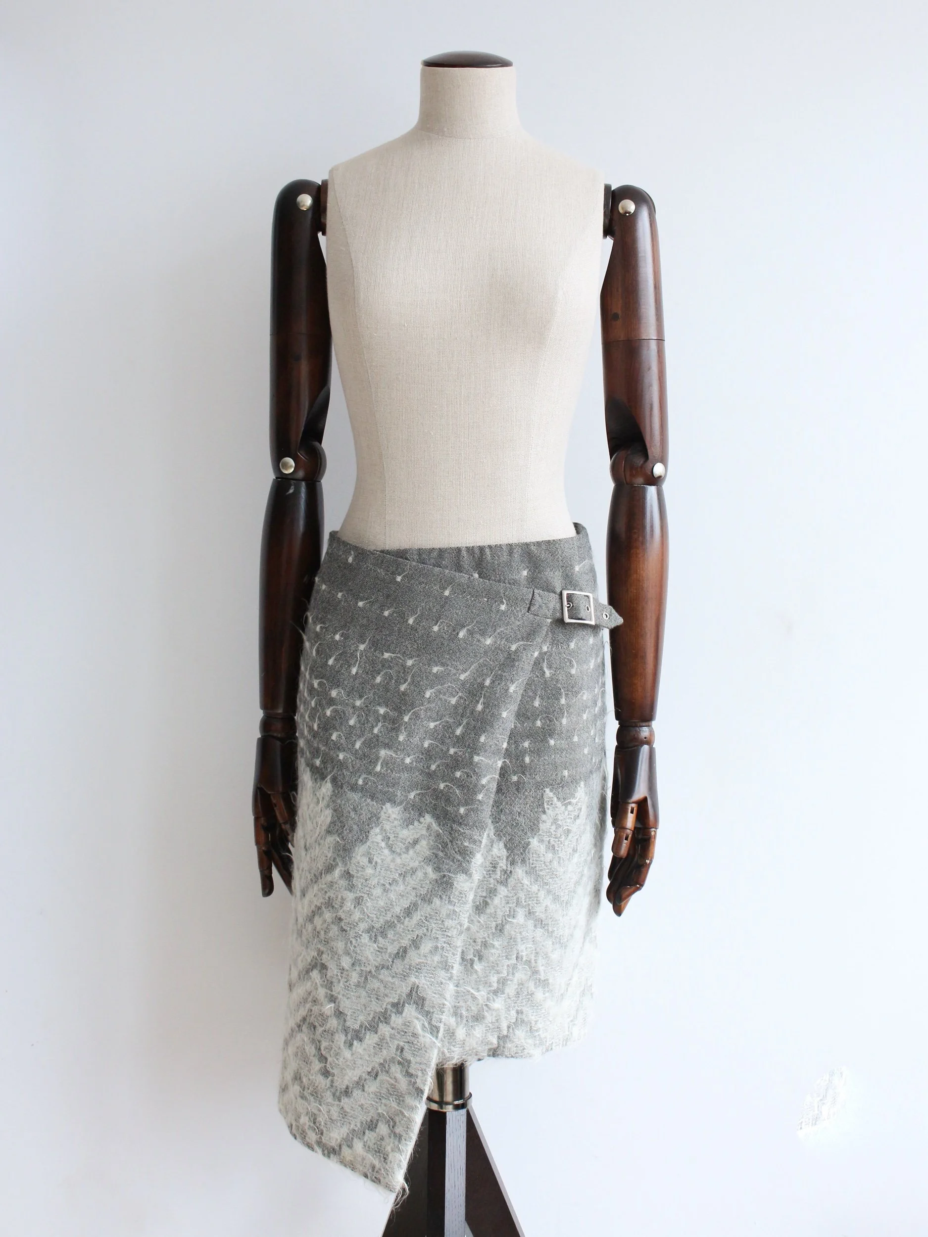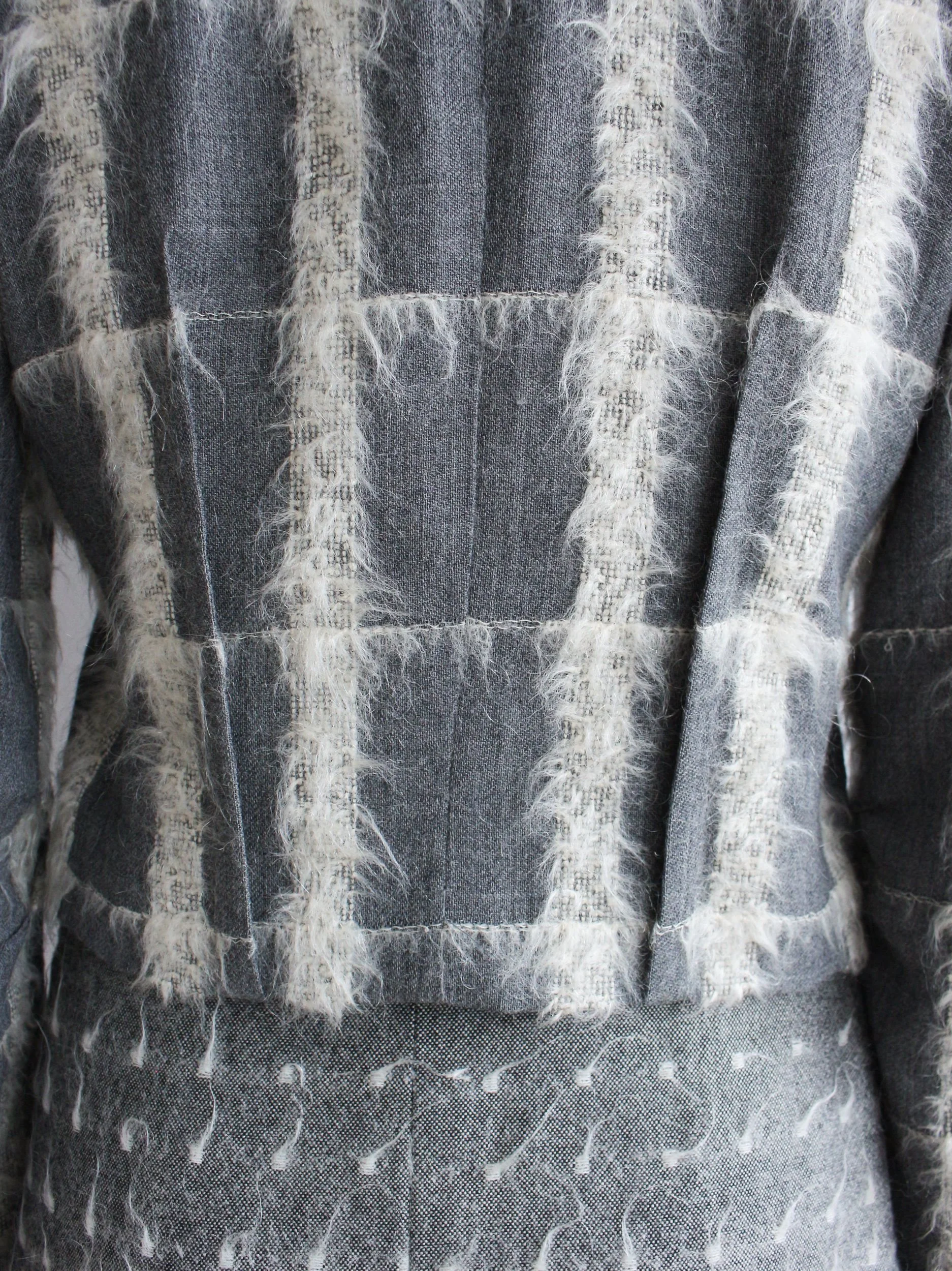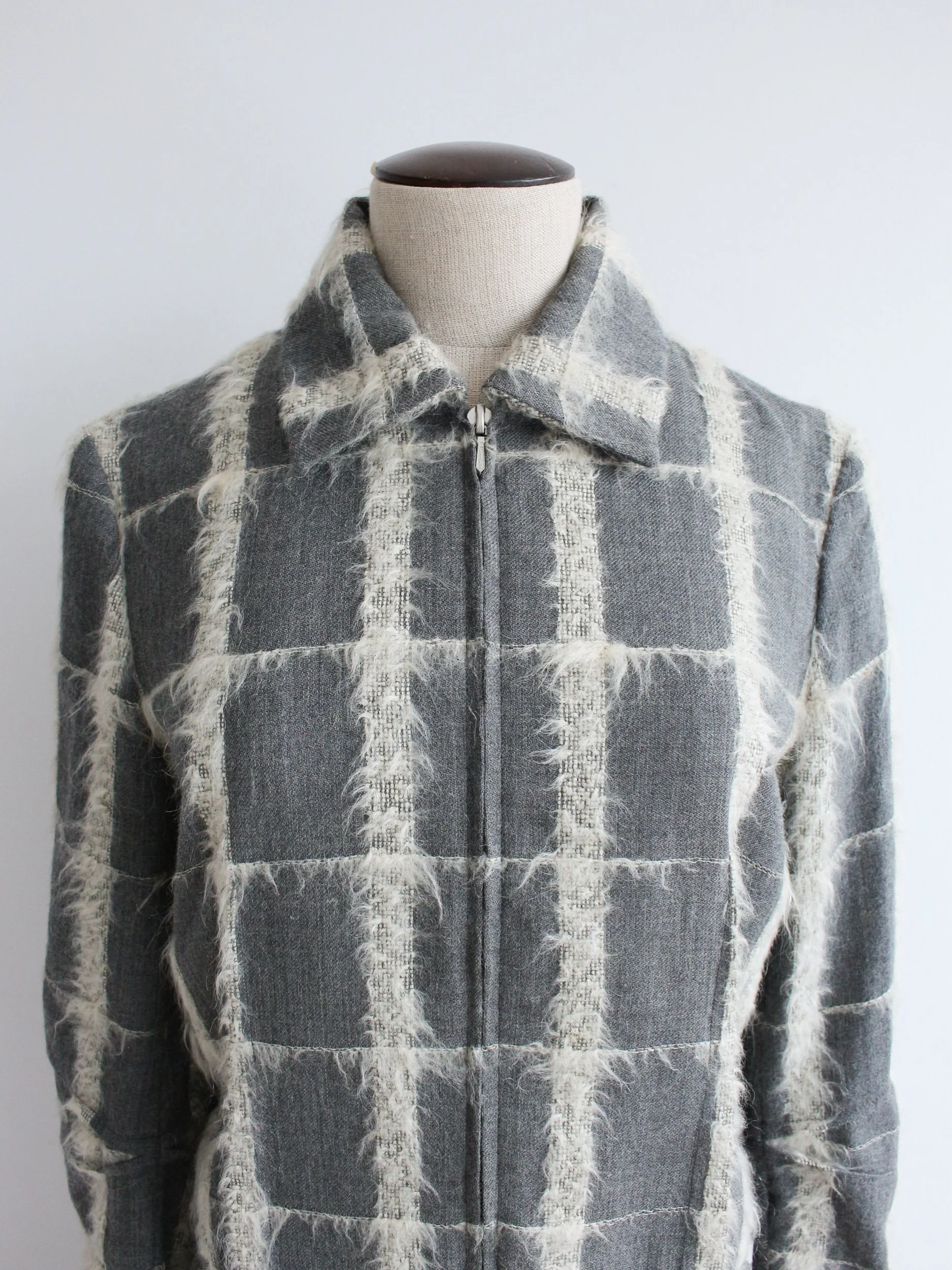 Christian Dior by John Galliano Autumn/Winter 2000 suit comprised of grey zipped jacket with mohair check and belted wrap skirt with mohair details.